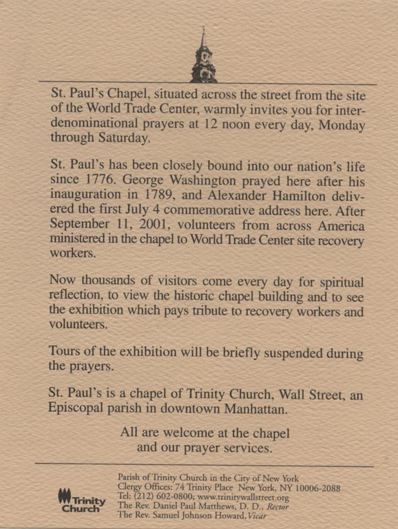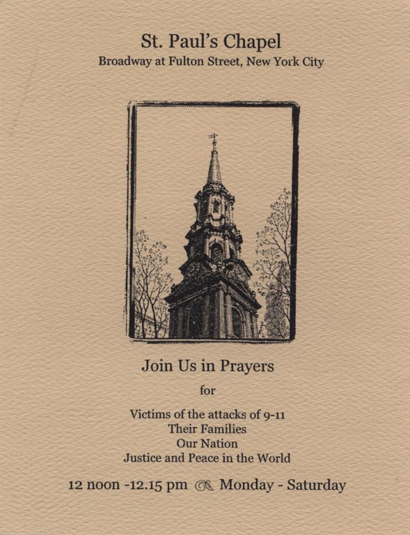 Images and memories 2001-2011: The images within the photo gallery below were assembled over the past 10 years. Many of the photographs were graciously contributed by the author, and St. Paul’s Chapel support volunteer and podiatrist, Dr. Arthur Gudeon. We wish to thank all who’s photos have found their way onto this site, and please contact us with corrections or if we’ve missed mentioning your name as a contributor. Thank you and God bless.
